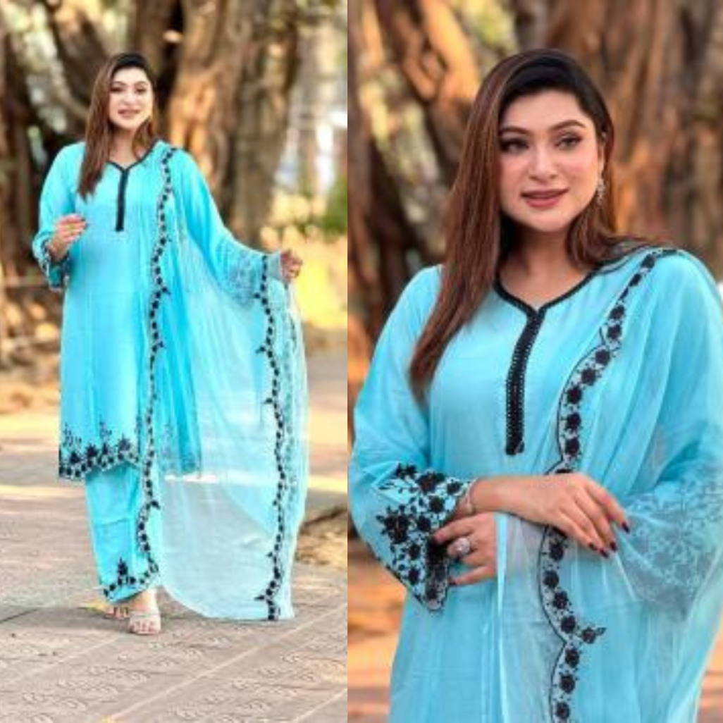 করা সম্পূর্ণ সেলাই করা থ্রি-পিস কালেকশন।