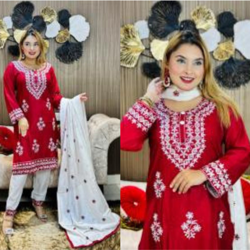 চিকেনকারি নেকলেস ডিজাইনের এমব্রয়ডারি কাজ করা থ্রি-পিস কালেকশন।।