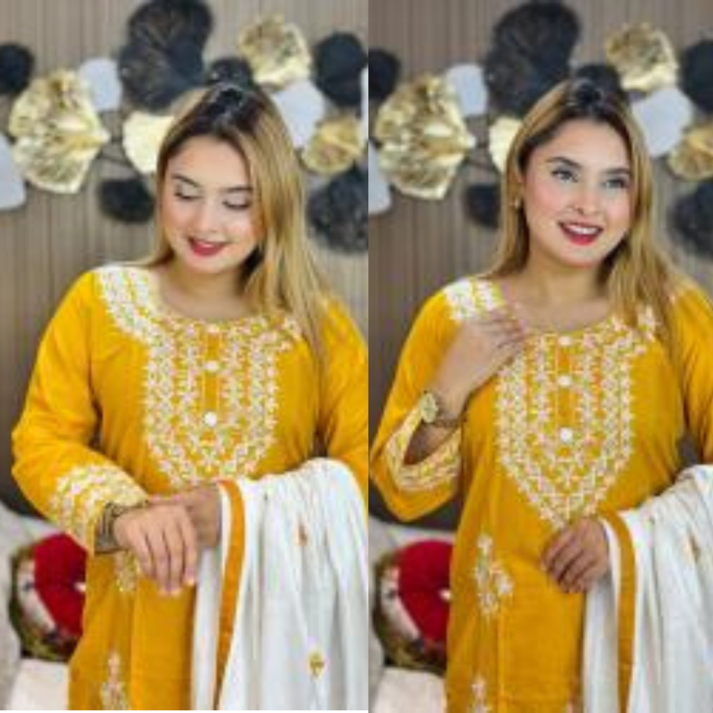 চিকেনকারি নেকলেস ডিজাইনের এমব্রয়ডারি কাজ করা থ্রি-পিস কালেকশন।।