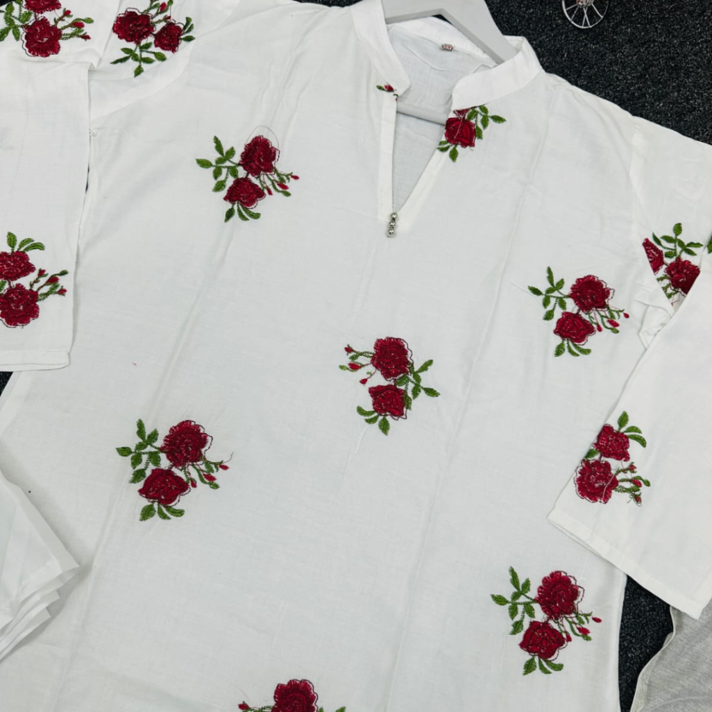 সাদা পরী,লাল গোলাপ এমব্রয়ডারি কাজ করা সম্পূর্ণ সেলাই করা থ্রি-পিস ।