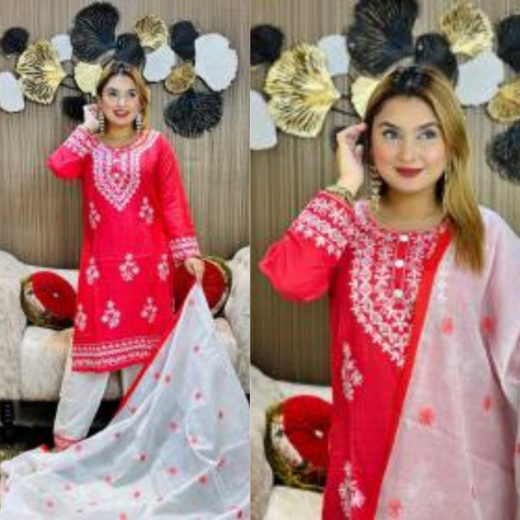 চিকেনকারি নেকলেস ডিজাইনের এমব্রয়ডারি কাজ করা থ্রি-পিস কালেকশন।।