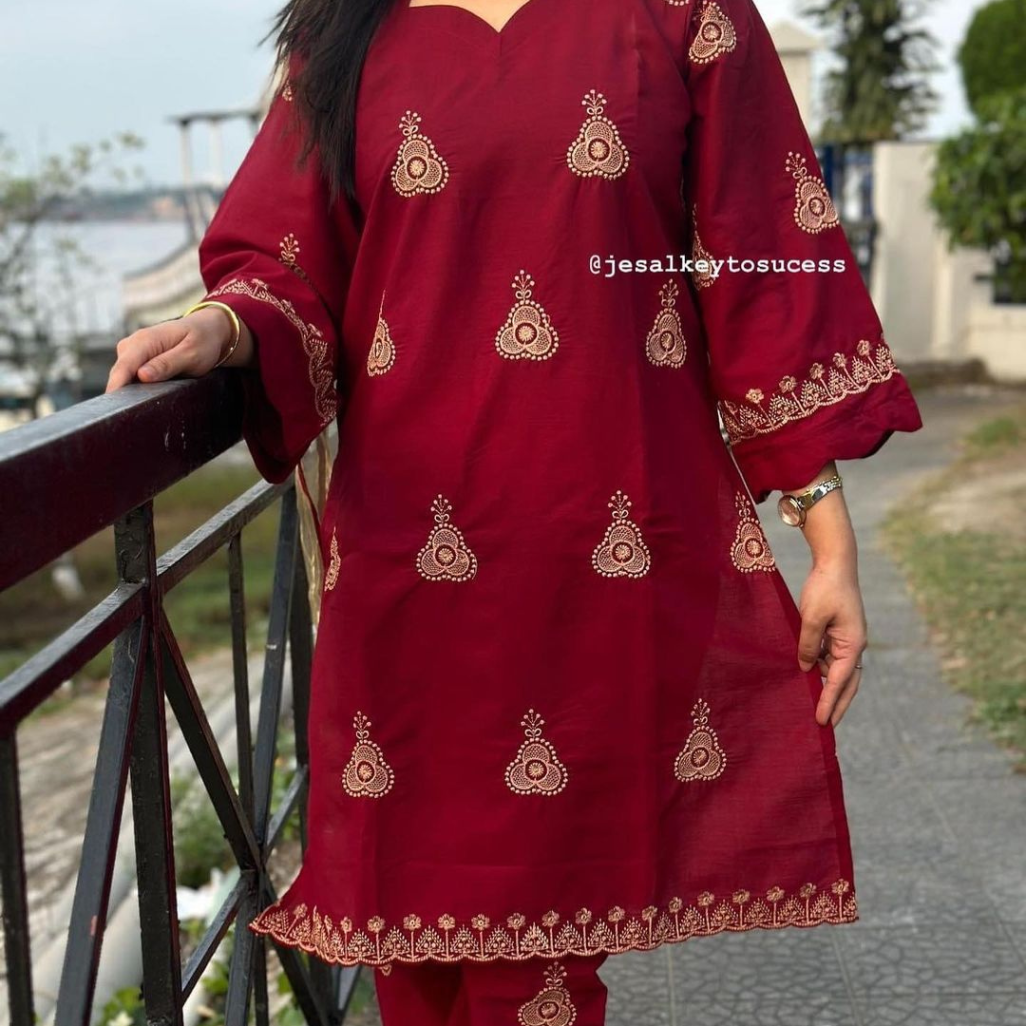 জামার নিচে হাতায় সুন্দর করে এমব্রয়ডারি কাজ করা থাকবে।